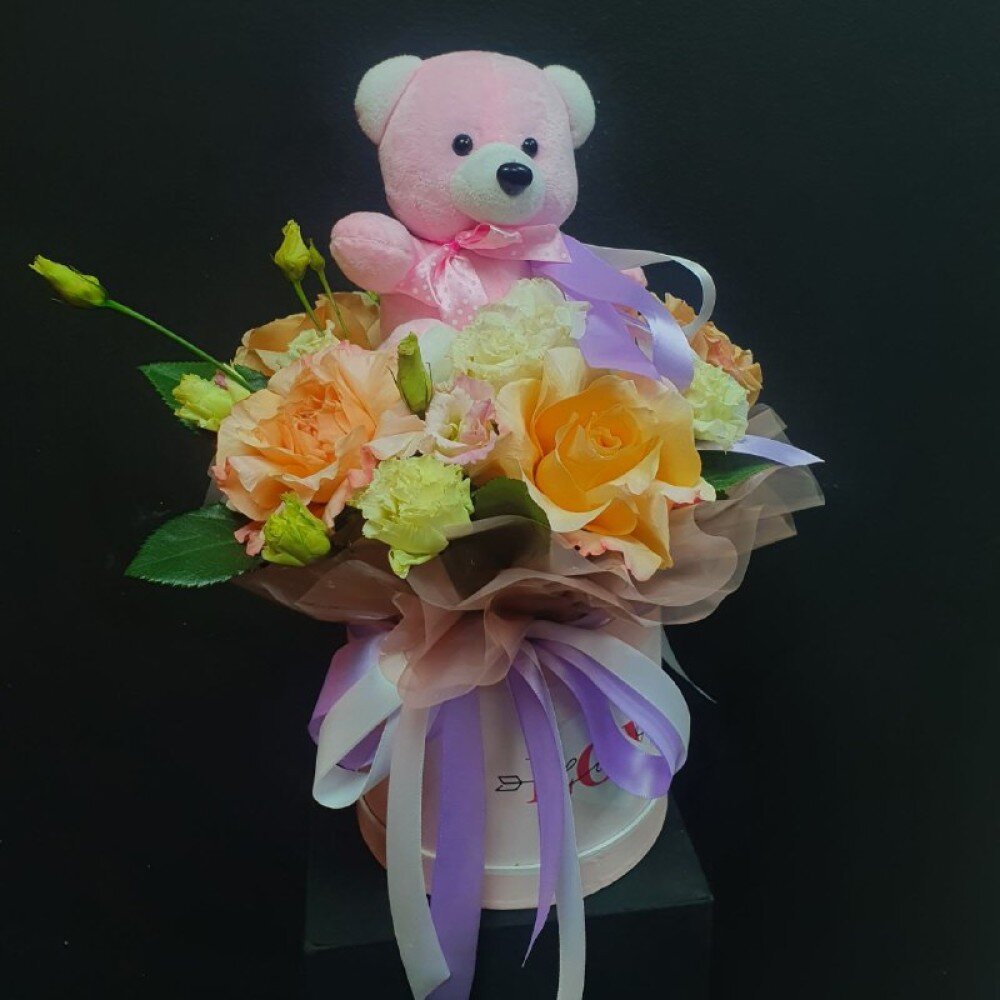Мягкая игрушка - 1 Коробка - 1 Роза - 3 Эустома - 3 Розва кустовая - 3 Оформление - 1