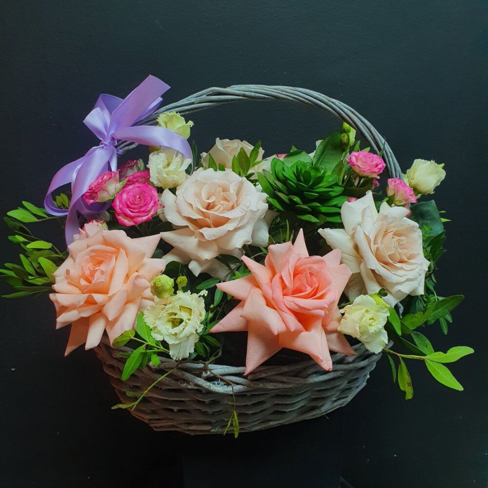 Корзина - 1 Оформление - 1 Роза - 7 Эустома - 4 Роза куст - 4 Фисташка - 3