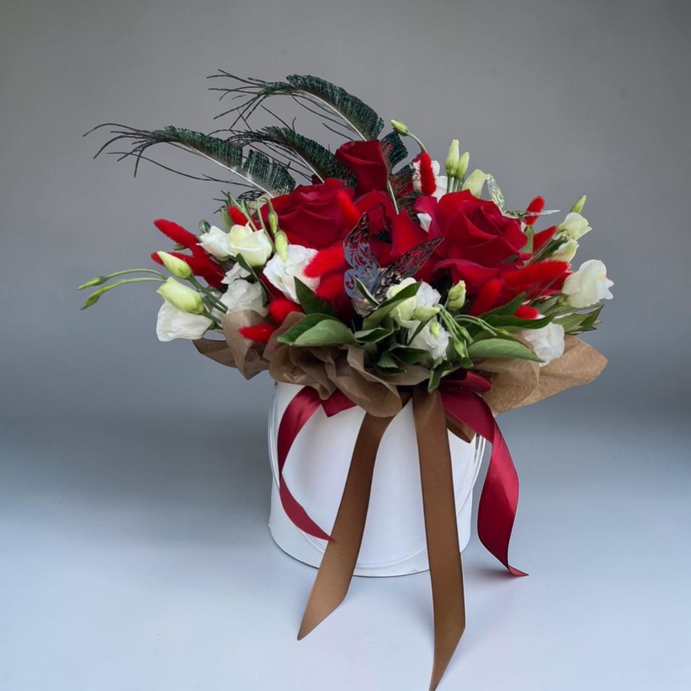 Роза-19 Хризантема одноголовая-11 Эвкалипт-5 Эустома-7 Оформление-1 Обращаем ваше внимание, что некоторые цветы в букете могут быть заменены из-за отсутствия в наличии или их несезонности.