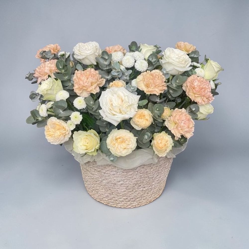 Диантус-11 Роза-9 Эвкалипт-4 Оформление-1 Обращаем ваше внимание, что некоторые цветы в букете могут быть заменены из-за отсутствия в наличии или их несезонности.