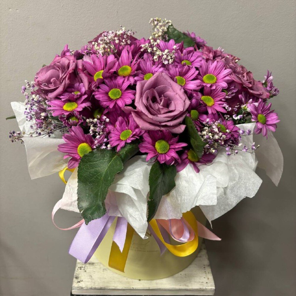 Коробка - 1 Роза - 5 шт Хризантема кустовая - 5 Гипсофила - 2 Оформление - 1