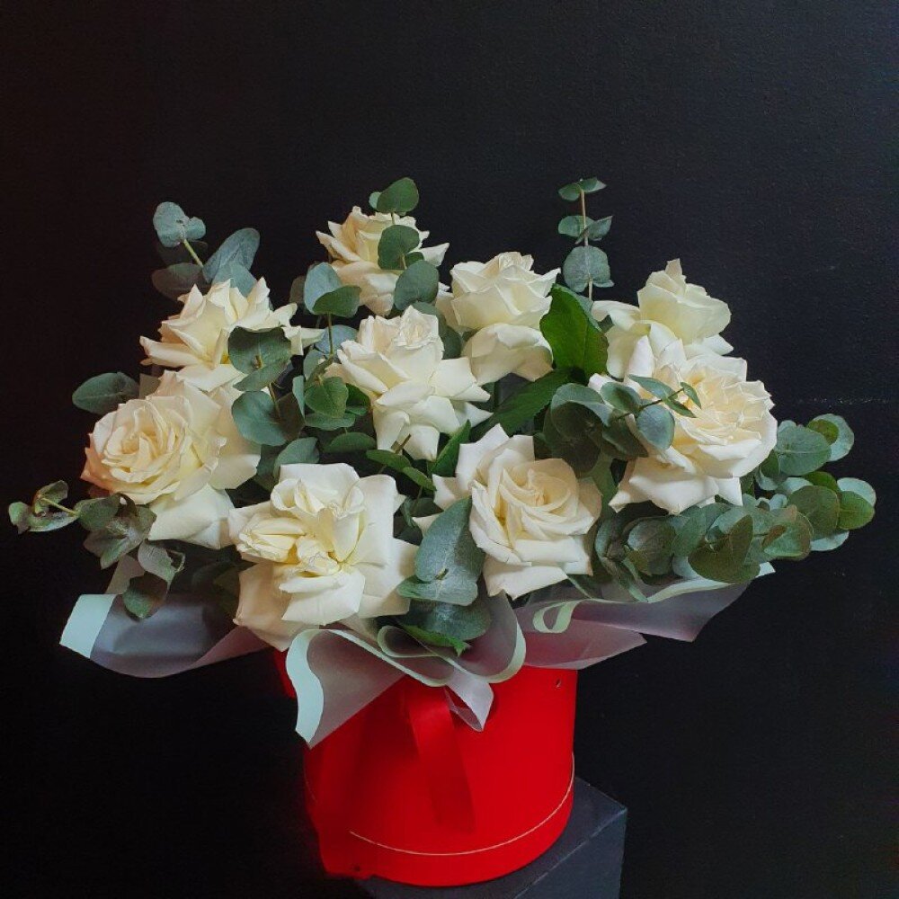 Коробка - 1 Оформление - 1 Роза - 9 Эвкалипт - 4